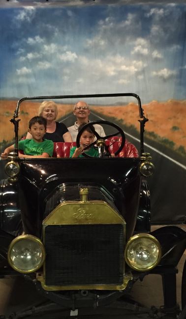 They did have a lot of cool exhibits, and Patrick got to see some Indian motorcycles and we did get to have our picture taken on on exhibit. Not sure if the car was too wide, or the backdrop too small, but they could have gone the extra mile!!